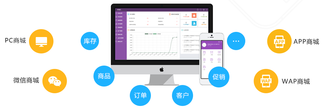 PC商城、WAP商城、微信商城、APP商城四大銷(xiāo)售渠道,客戶(hù)、商品、訂單、庫(kù)存、促銷(xiāo)互聯(lián)互通,實(shí)現(xiàn)一站式統(tǒng)一管理。